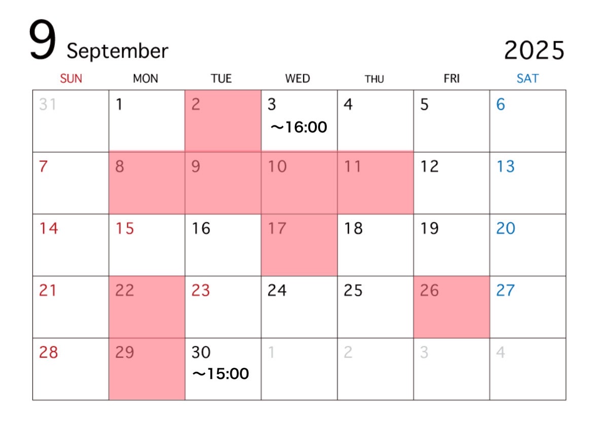 休業日: 2(火),8(月),9(火),10(水) ,11(木) ,17(水) ,22(月) ,26(金) ,29(月)
