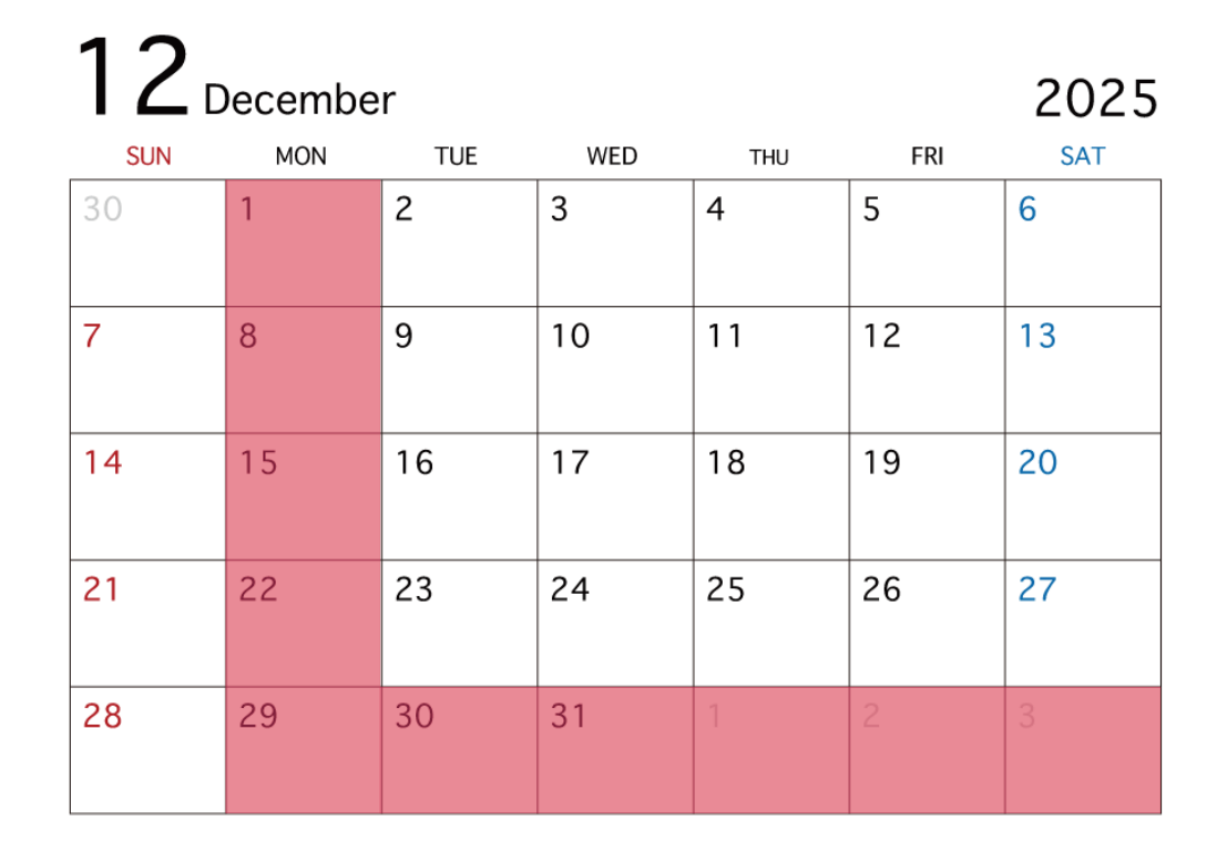 休業日: 1(月) , 8(月) , 15(月) ,22(月) ,29(月) ,30(火) ,31(水)