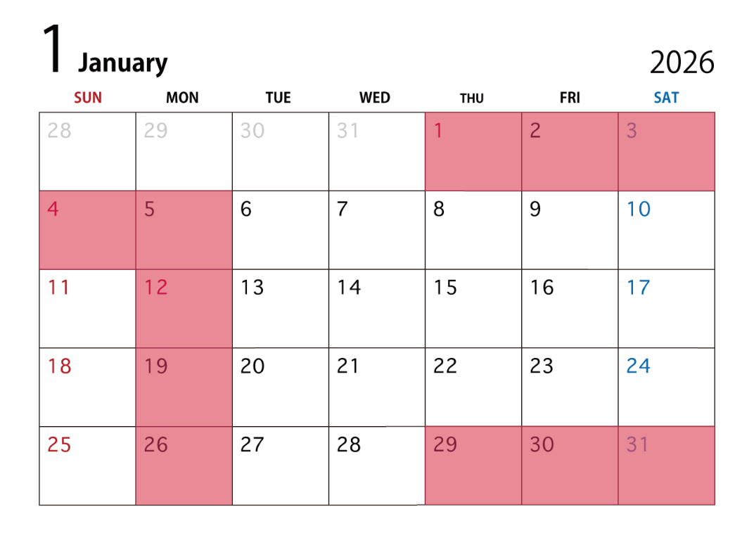 休業日: 1(木) , 2(金) , 3(土) ,4(日) , 5(月) ,12(月)