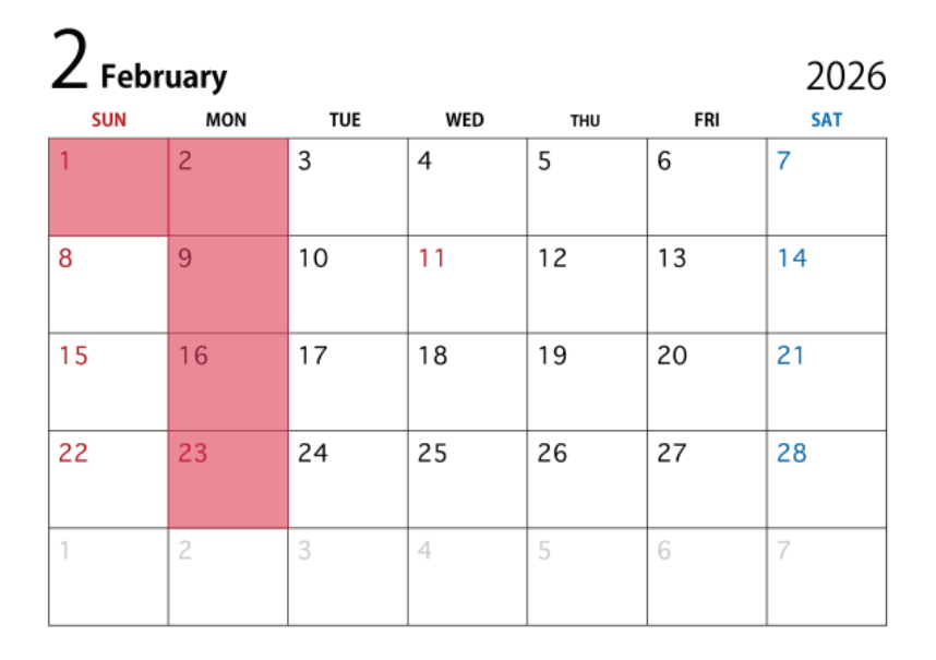 休業日: 1(日) , 2(月) , 9(月) ,16(月) ,23(月)