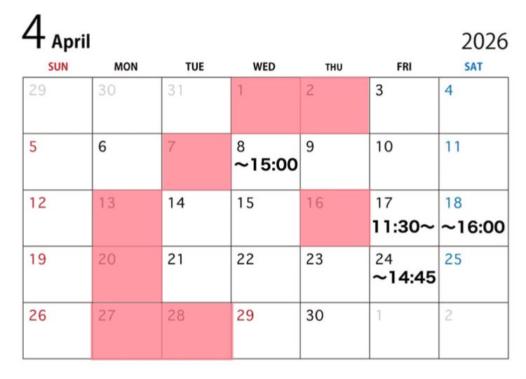 休業日: 1(水),2(木),7(火),13(月) ,16(木) ,20(月) ,27(月) , 28 (火)